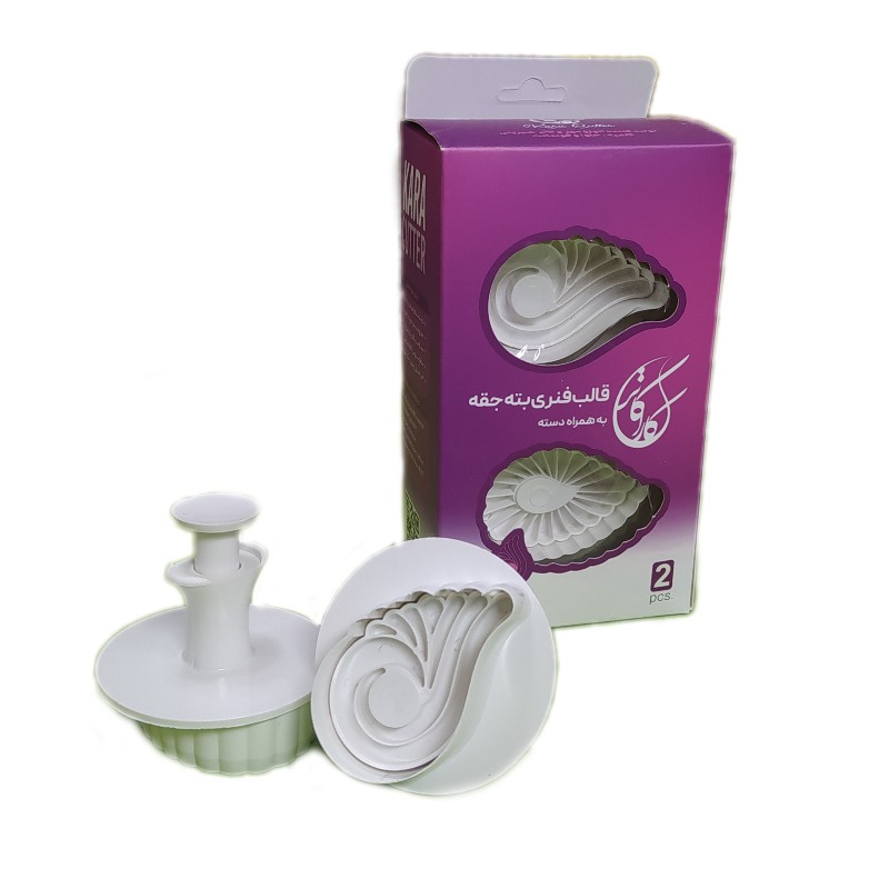 قالب فشاری بته جقه 2عددی از جنس پلاستیک  می باشد که برای شیرینی مربایی که مناسب عید می باشد و برای بیسکوییت استفاده میشود.